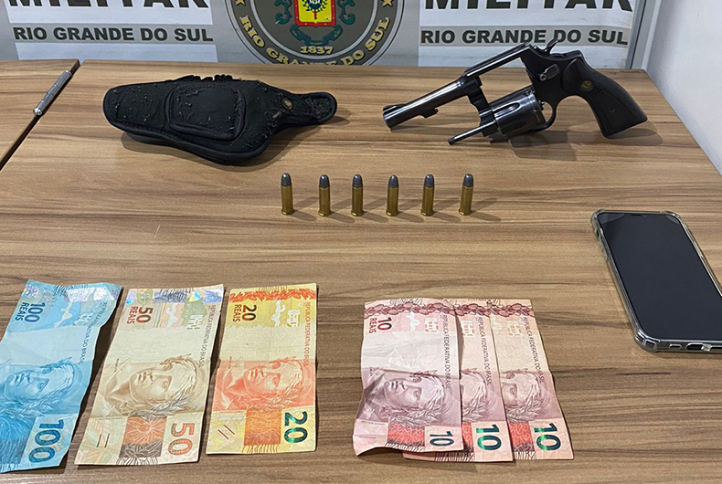 Com ele, foram apreendidos um revólver calibre 38 municiado com seis cartuchos intactos, um coldre, R$ 200 em dinheiro e um celular. O homem foi encaminhado para a delegacia de polícia para registro da ocorrência.