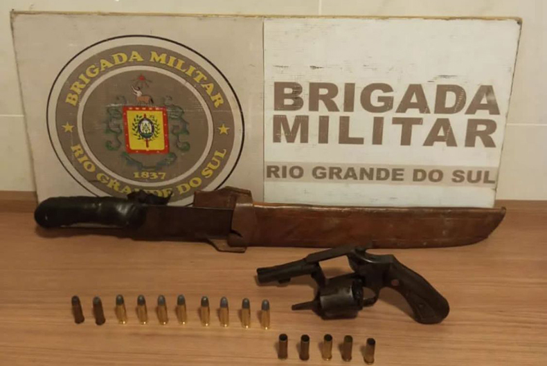 Conforme os policiais, durante busca veicular, foi localizado no banco do passageiro um facão e um estojo com revólver Rossi calibre 38, com numeração raspada, carregado com seis munições intactas e com cinco munições já deflagradas.