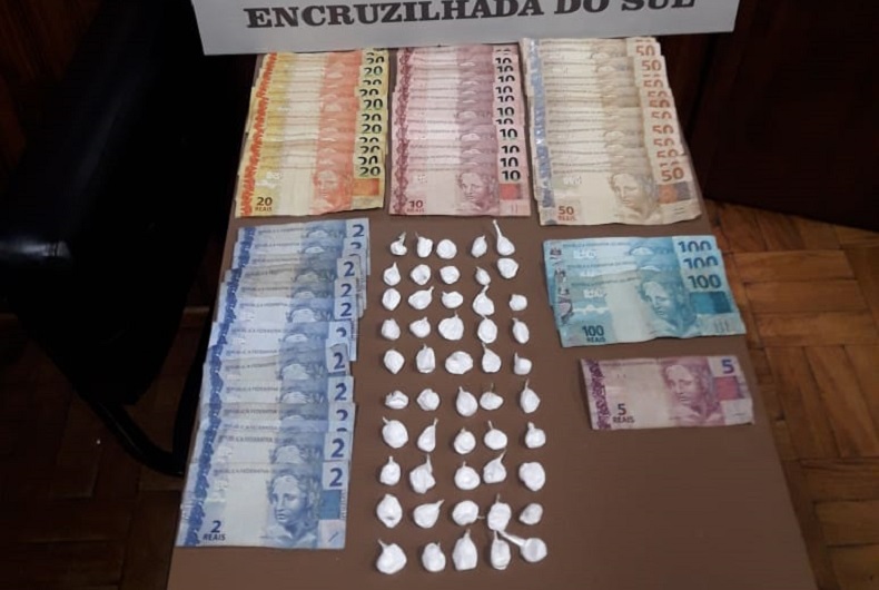 Um dos homens confessou que estava comprando drogas no local. Na residência, foram encontradas 49 porções de cocaína e R$ 1.503,00, dentro de uma sacola. O outro homem, que estava vendendo o ilícito, foi preso por tráfico. Os dois foram levados à Delegacia de Polícia, para registro do caso.