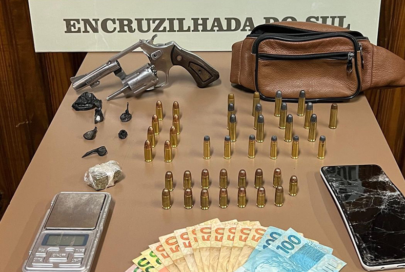 Na pochete, foram encontradas mais de 40 munições de diferentes calibres e uma balança de precisão. Além disso, o homem também estava com porções de cocaína, maconha, entre outros itens pessoais. O homem recebeu voz de prisão e foi encaminhado à delegacia para o registro em flagrante.