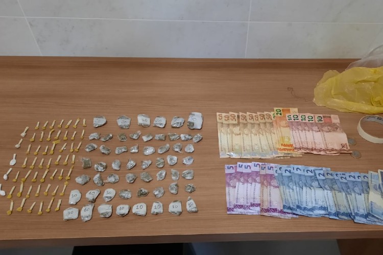 Com ele, foram localizadas quatro pedras de crack e duas porções de maconha. O homem ainda indicou o local de armazenamento do restante da droga, onde foram localizadas 55 porções de maconha, pesando 109 gramas, 50 pedras de crack de 11 gramas, três petecas de cocaína de um grama e R$ 554,00.