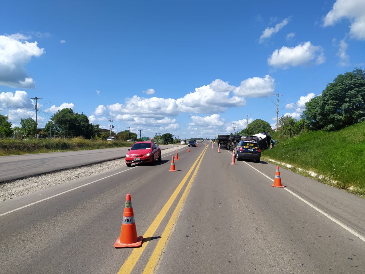 Conforme informações da Polícia Rodoviária Federal, o condutor do veículo sofreu ferimentos e foi encaminhado para atendimento médico. O caminhão, com placas de Morro da Fumaça, Santa Catarina, segue tombado à margem da estrada. O trânsito flui normalmente.