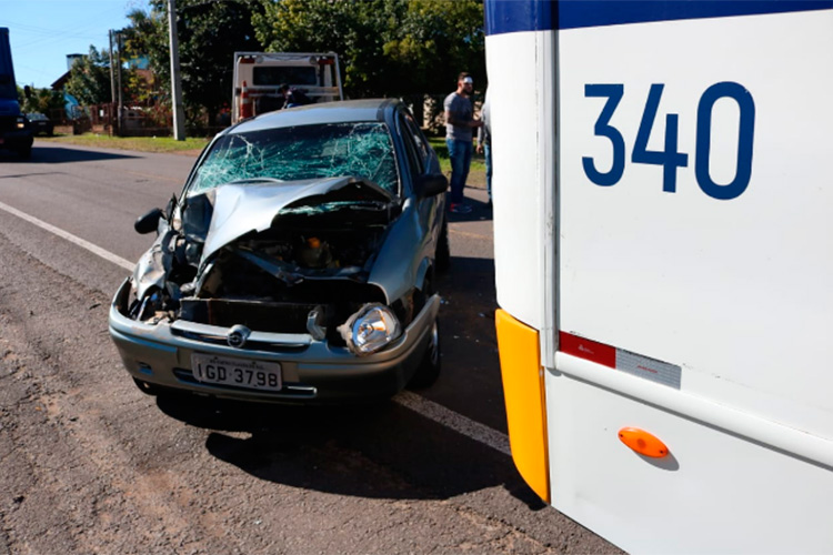 Um homem ficou ferido na colisão de um GM Corsa Super com um ônibus do Consórcio TCS, na tarde desta quarta-feira, 17, por volta das 13h30, na Avenida Deputado Euclydes Nicolau Kliemann, no Bairro Progresso, em Santa Cruz do Sul. Ele sofreu escoriações e foi levado pelo Samu para atendimento na UPA Esmeralda.