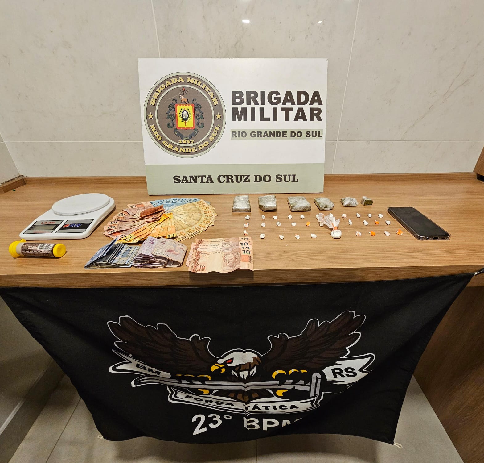 Duas pessoas foram presas por tráfico de drogas na Avenida Euclides Kliemann, em Santa Cruz do Sul neste sábado, 2. Durante patrulhamento, a guarnição recebeu informações de que um indivíduo estaria vendendo drogas em um residencial. Ele foi abordado e com eles estavam 19 porções de cocaína e R$ 119,00 em espécie.