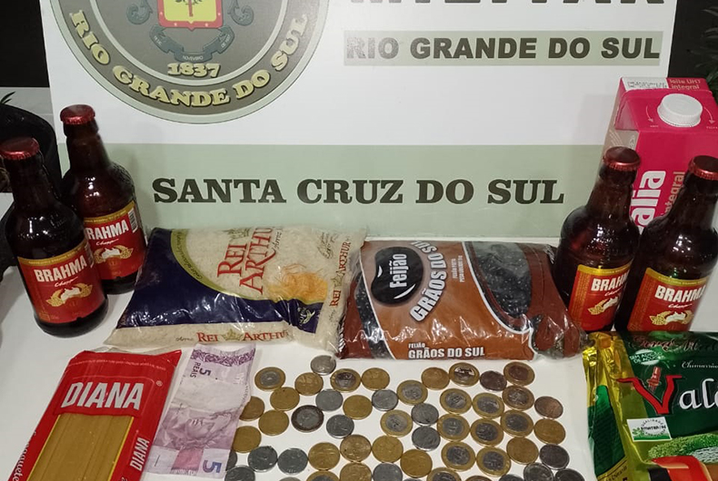 Dentro de uma mochila abandonada durante a fuga, os policiais apreenderam um quilo de feijão, um quilo de arroz, um pacote de erva-mate, um litro de leite, um pacote de massa, três garrafas de cerveja e R$ 60 em dinheiro.