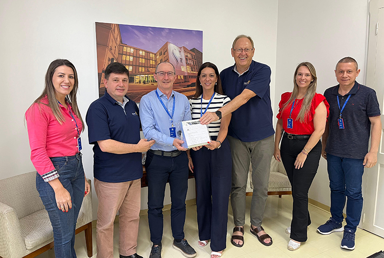 Participaram da entrega: a analista de relacionamento e serviços do CDII, Aline Marques Rocha, Paulo Roberto Haussen Sehn, Vilmar Thomé, a assessora de projetos e captação de recursos do hospital, Luiza Machado Lima, Milton Lorenz e os assistentes de projetos e captação de recursos Tamara Riediger e Evandro Leal Melo