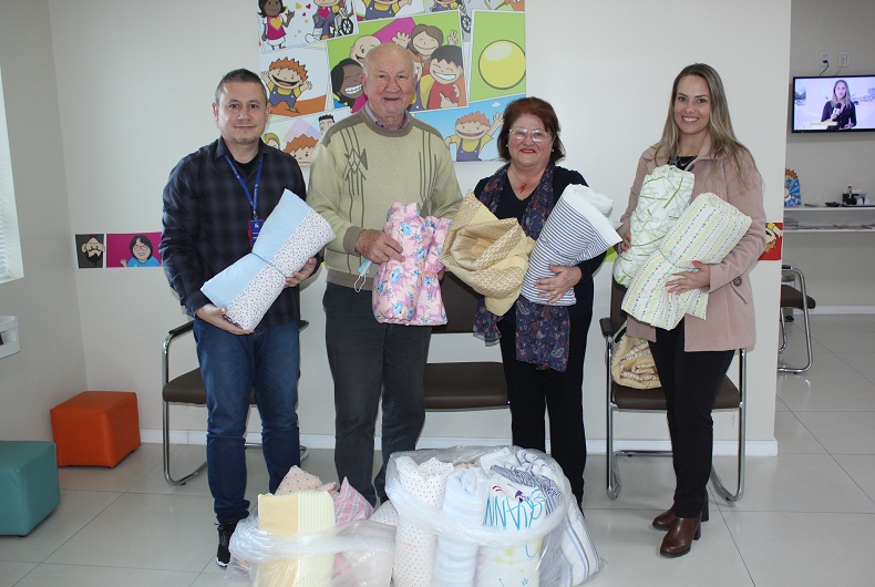 A artesã Margit Altermann produziu e doou ao Hospital Santa Cruz (HSC) 18 cobertores infantis, que serão destinados à área materno-infantil da Instituição. Ela e seu marido Erneldo Carlos Altermann entregaram o material nesta quarta-feira, 3, para os assistentes de projetos e captação de recursos da Instituição, Evandro Leal Melo e Tamara Riediger.
