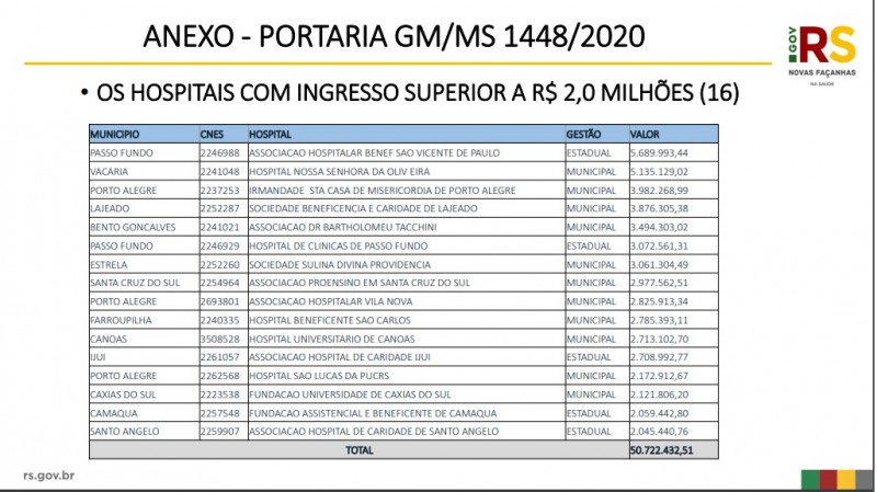 Deste valor da segunda parcela, R$ 92,9 milhões são para o Estado, contemplando 158 hospitais filantrópicos e santas casas. Por exemplo, o Hospital São Vicente de Paulo, localizado em Passo Fundo, que é um dos municípios com mais casos confirmados de coronavírus do Rio Grande do Sul, receberá quase R$ 5,7 milhões.