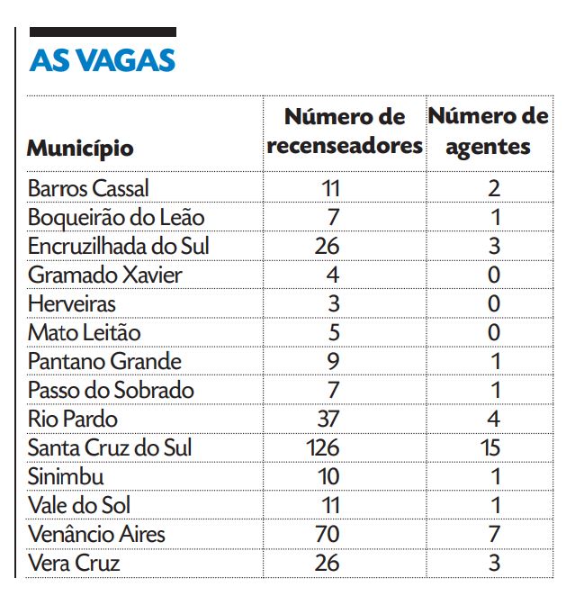 Somente na região do Vale do Rio Pardo são 391 vagas, a maioria delas para o cargo de recenseador – 352. Outras 39 serão divididas entre agente censitário supervisor (ACS) e agente censitário municipal (ACM). As inscrições para ACM e ACS começaram às 10 horas desta sexta-feira, 19, e vão até o dia 15 de março no site do Cebraspe. A taxa de inscrição custa R$ 39,49.