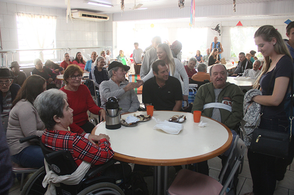 Ersildo Scholosser, que no mês passado completou um ano de estadia no asilo, foi um dos residentes que mais recebeu convidados. Ao todo foram 13 pessoas, entre filhos, netos e bisnetos, que passaram a tarde fazendo companhia para o aposentado de 79 anos. No centro da roda de chimarrão, seu Ersildo tocou gaita, cantou, e se emocionou ao falar da esposa, Lucila, que também marcou presença na celebração. “Tava com muita mas muita saudade da minha ‘véia’”, contou.