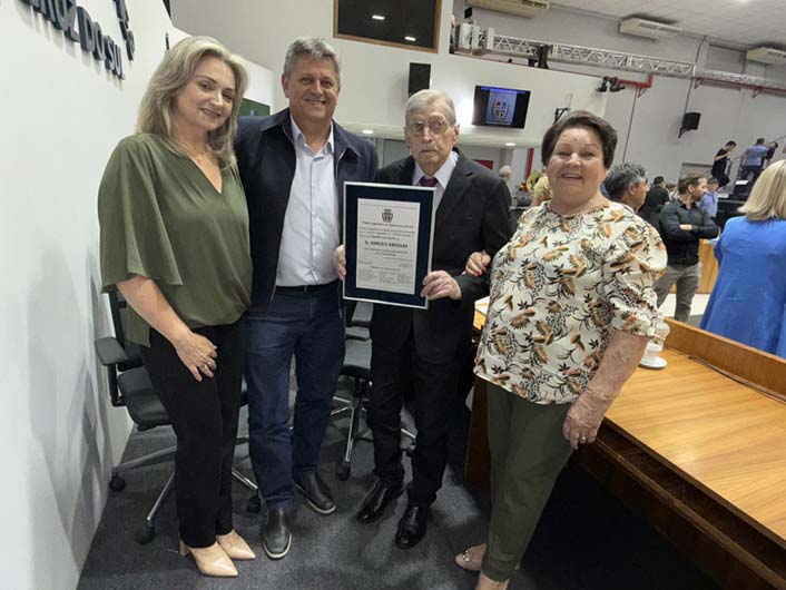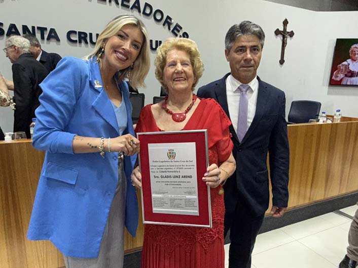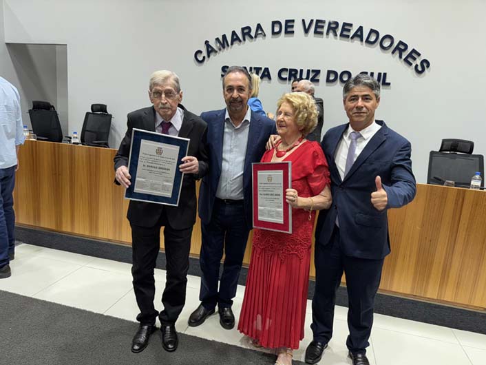 Darcilo Gressler, o Zézinho e a cabeleireira Gladis Lenz Arend foram muito festejados na noite da última segunda-feira, 1º, na Câmara de Vereadores, onde foram agraciados com os títulos de Cidadão e Cidadã Honorários. Depois da bonita solenidade, os familiares e amigos foram recepcionados no Centro Cultural 25 de Julho.