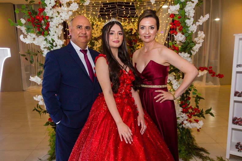 Os pais Rosele e Edir Luiz Azambuja de Souza e o irmão Luiz Eduardo Guterres de Souza, com assessoramento de Michele Henn Waechter, receberam com muita alegria familiares e amigos na noite do sábado passado, 1º, nos salões do Avenida, para festejar os 15 anos de Ana Luiza Guterres Azambuja de Souza.