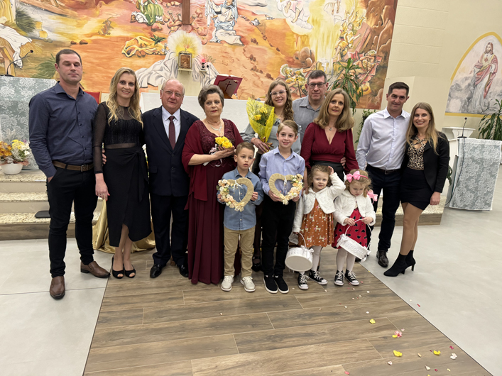 Os estimados Clarissa e Milton Weigel comemoraram sábado 50 anos de casamento, as bodas de ouro. No final da tarde foi celebrada uma missa de Ação de Graças, na Igreja Ressurreição. Depois o casal jubilar e suas filhas, Claudia Aline Weigel e o namorado Rodrigo Hoffmann e o filho Erik Hoffmann, Cristiabe Raquel Weigel e o marido Ezio Zerbielli e as filhas, as gêmeas Poliana e Giovana e Martina, Carin Suzane Weigel e o marido Gerson Waechter, e o filho Pedro Henrique receberam demais familiares e amigos para um jantar no Restaurante do Xampu.
