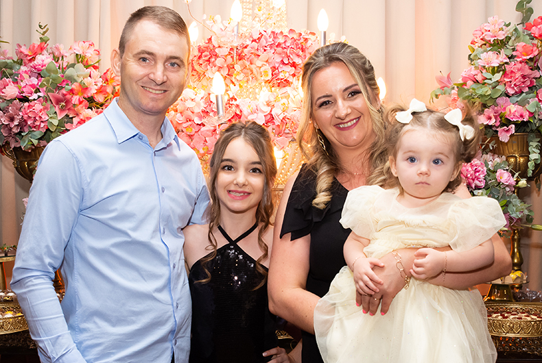 Eduarda Nyland, ao lado do namorado Thiago Helfer, dos pais Geneci e Eloi Nyland e da mana Gabriella Luisa, festejou na noite do sábado passado sua formatura no curso de Arquitetura e Urbanismo da PUC-RS. Recebeu os familiares e amigos para os brindes, jantar e danças no Tênis Clube Santa Cruz.