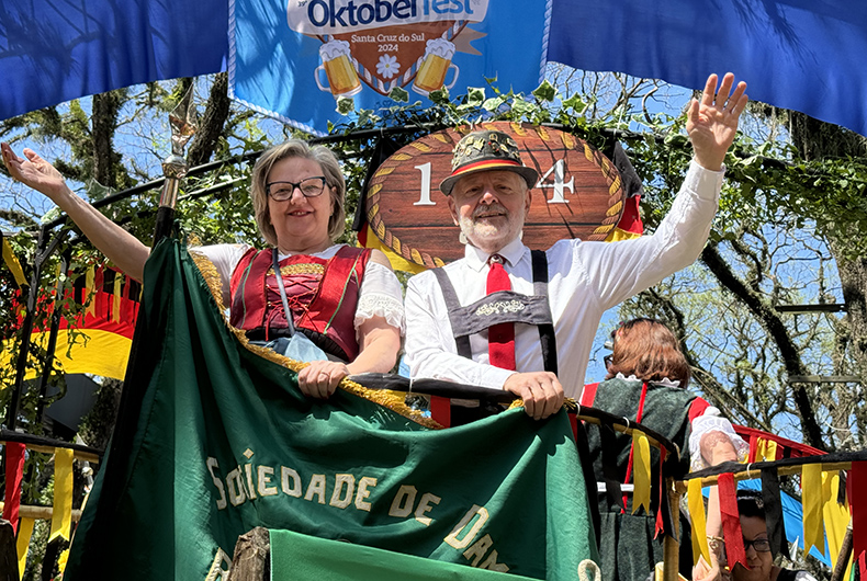 O ex-comandante do 7º BIB, cel. Christian Cravo e a esposa Consuelo, agora residindo em Santa Cruz do Sul, participaram do primeiro desfile da 39ª Oktoberfest.