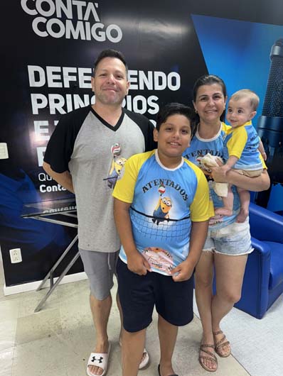 Léo Lopes e Fernanda Tavares e os filhos Vicente e João Lucca, do grupo Atentados, que está realizando uma campanha de material escolar para repassar a alunos carentes.