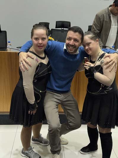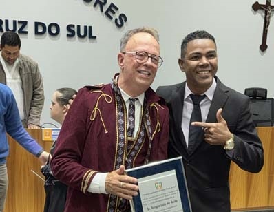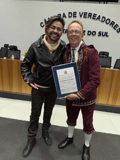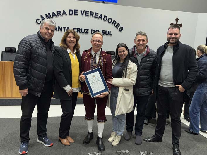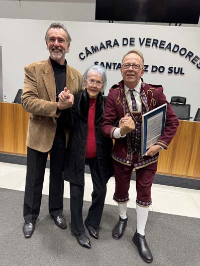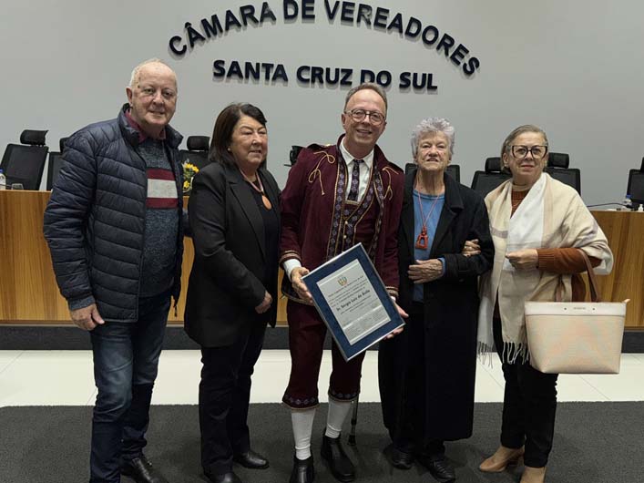 Na maior emoção e vestindo um estiloso traje germânico da cor vinho, o sempre aplaudido coreógrafo Sérgio Ávila recebeu na noite da última segunda-feira, 9, o título de Cidadão Santa-cruzense, proposta do vereador Jéferson Redondo. Depois da cerimônia, abrilhantada com uma bonita apresentação de ginástica rítmica com fitas das alunas da Apae Larissa Kannenberg e Letícia de Freitas Lautert, o novo cidadão santa-cruzense, ao lado de sua mãe Teresinha de Ávila e irmãos Flávio e Isabel de Ávila, que são gêmeos, e Solange de Ávila, recebeu seus amigos no Parque da Oktoberfest para comemorar. Reconhecimento merecido.