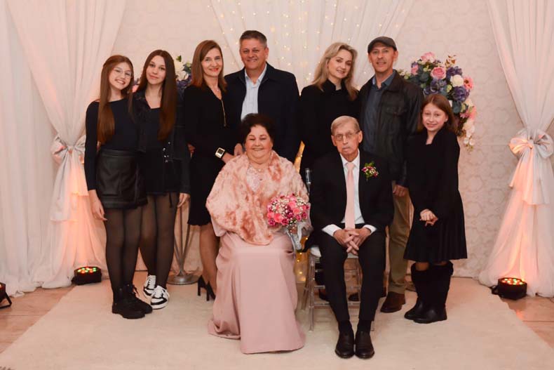 Os estimados Ereci Odete e Darcilo Gressler, ao lado dos filhos Márcia Helena Gressler Trindade, Marcos Fernando Gressler e suas famílias, festejaram na última sexta-feira, 6, passada, com um jantar, 60 anos de casamento – bodas de diamante – na sede do FC Rio Pardinho.