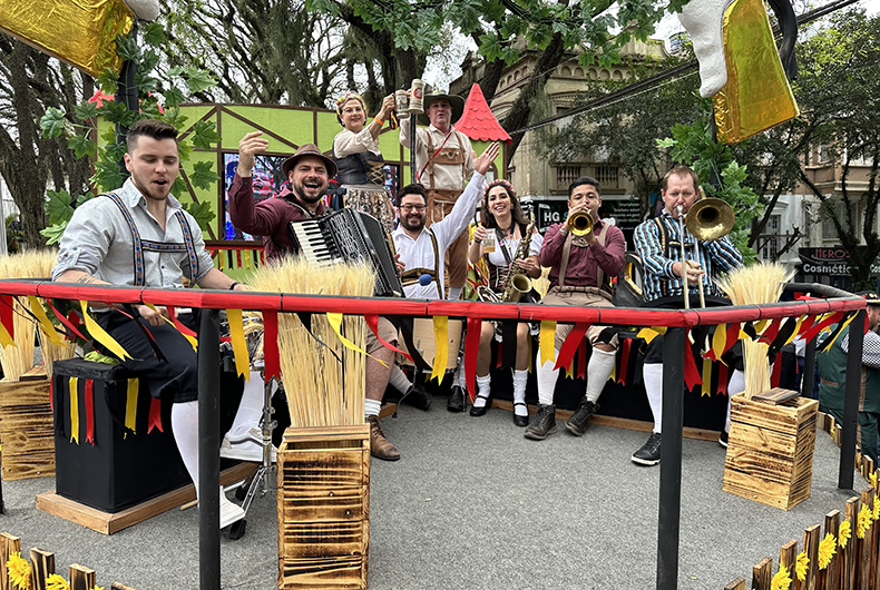 O último carro alegórico do desfile da 38ª Oktoberfest de Santa Cruz do Sul, o famoso Bierwagen, mais uma vez trouxe os músicos da banda Magia.