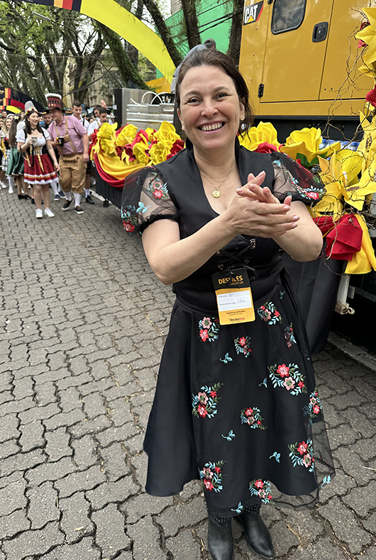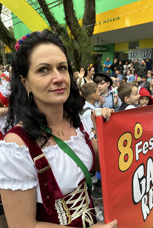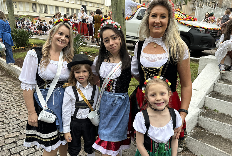 A rainha da 14ª Oktoberfest de Santa Cruz do Sul, Cristina Schuh Kothe, a Tina, que está residindo em Balneário Camboriú, participou do primeiro desfile com as demais soberanas.
