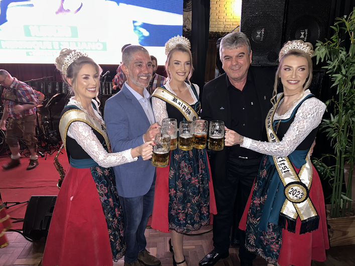 Daniela Schoeninger, Luciano Menzes, Camila Eduarda Schaefer, João Goerck e Marília Fischer, brindando as atrações musicais da 38ª Oktoberfest de Santa Cruz
