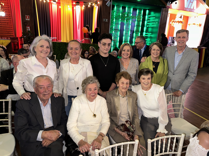 Suzana Wink, Cristiane Wink, João Vitor Wink, Silvia Wink Geske, Sandra Wink e Ronaldo Wink; e sentados, Mário Wink, Carmen Wink, Mercedes Wink e Raquel Wink, na 38ª Oktoberfest, que marca a inauguração do Centro de Eventos que leva o nome do saudoso ex-prefeito santa-cruzense Armando Wink | Foto: Ike