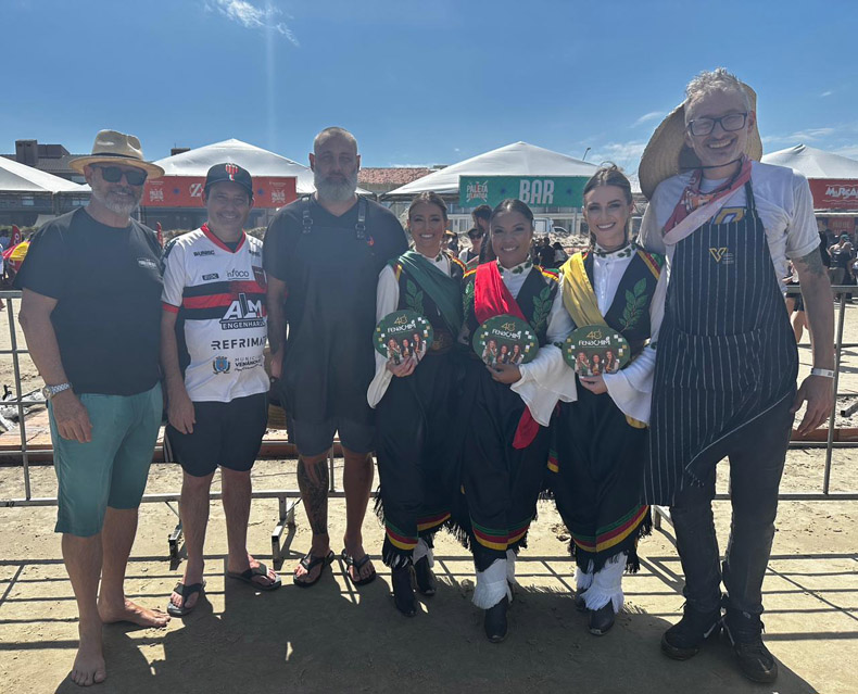 César Spohr, o prefeito de Venâncio Aires, Jarbas da Rosa, o chef Tiago Wasum, as soberanas da Fenachim, Taliana Silva, Maiéle dos Santos e Fátima Neitzel, e o chef Vadson Schafer, de Santa Maria, sábado passado em Xangri-Lá, no Paleta Atlântida