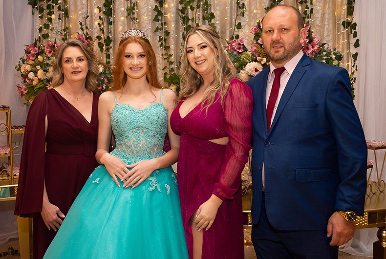 A Mannsão ganhou uma decoração toda especial para a comemoração dos 15 anos de Stéphani Junkherr, que ao lado dos pais Tatiana Inês Lersch e Luciano Luís Junkherr, da mana Gabrieli Junkherr e com assessoria de Thais Werner Eventos, recebeu familiares e convidados.