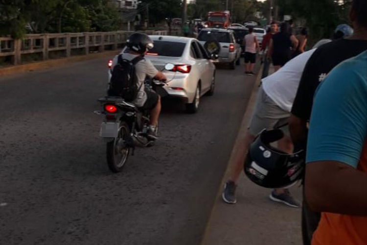 Uma das imagens mostra pessoas olhando sobre a guarda de uma ponte