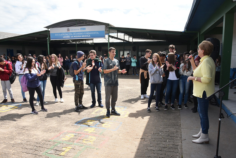 A Prefeitura de Santa Cruz do Sul inaugurou na manhã desta sexta-feira, 29, as obras de ampliação da Escola Municipal de Ensino Fundamental Leonel de Moura Brizola, situada no Bairro São João. Dezenas de alunos esperaram no pátio pela chegada da prefeita Helena Hermany, que acompanhada pelo vice-prefeito Elstor Desbessell, foi recepcionada com abraços e aplausos.