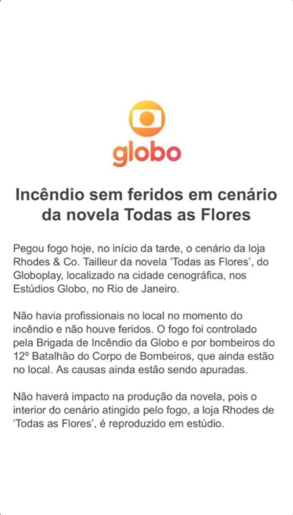 Segundo a emissora, o fogo foi controlado pela Brigada de Incêndio da Globo e por bombeiros do 12º Batalhão do Corpo de Bombeiros, que ainda estão no local. As causas estão sendo apuradas. A Globo disse ainda que foi atingido o cenário da loja Rhodes & Co. Tailleur, da novela Todas as Flores, uma produção do Globoplay. “Não haverá impacto na produção da novela, pois o interior do cenário atingido pelo fogo é reproduzido em estúdio”, afirma a nota.
