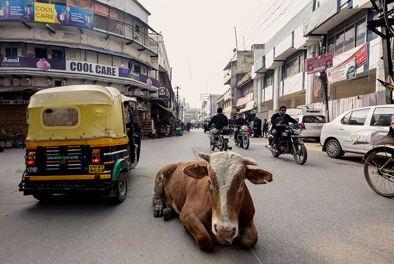 Na Índia, a vaca é animal sagrado e não é raro vê-la perambulando por ruas das cidades ou se acomodando para descansar onde bem lhe aprouver | Foto: GB Imagem