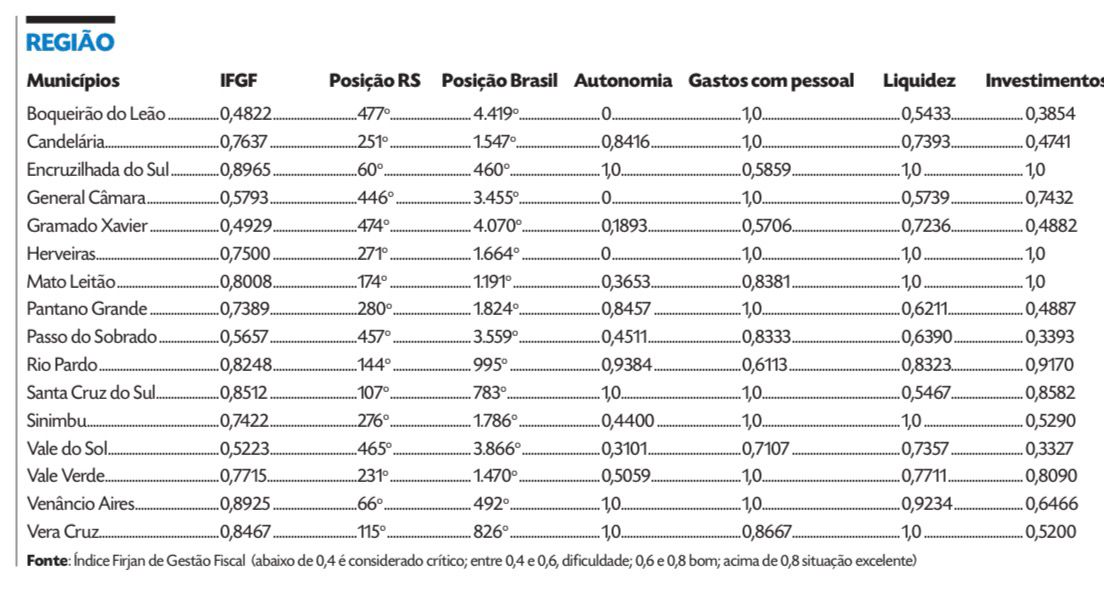 O município com o melhor IFGF do Vale do Rio Pardo, em 2024, foi Encruzilhada do Sul. Conseguiu a nota 0,8965, que é considerada de excelência. Nos quesitos autonomia, liquidez e investimentos obteve o indicador máximo (1,0), ficando com conceito de dificuldade na questão de gastos com pessoal (0,5859). Na sequência vêm Venâncio Aires, com 0,8925; Santa Cruz do Sul, 0,8512; e Vera Cruz, 0,8467.