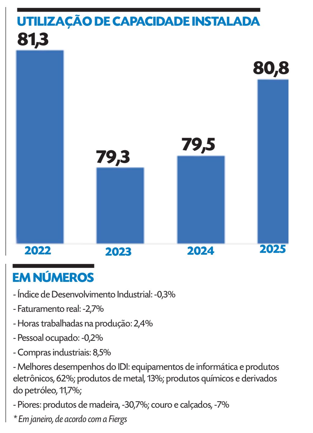 “O resultado revela que a atividade no setor continua oscilante e praticamente estagnada desde julho de 2024, quando interrompeu o processo de recuperação das enchentes”, afirma o presidente da Fiergs, Claudio Bier. Na comparação mensal, apenas as compras industriais e as horas trabalhadas na produção subiram – 8,5% e 2,4%, respectivamente. A utilização de capacidade instalada (UCI) ficou em 80,8% em janeiro, ante 81,3% em dezembro.