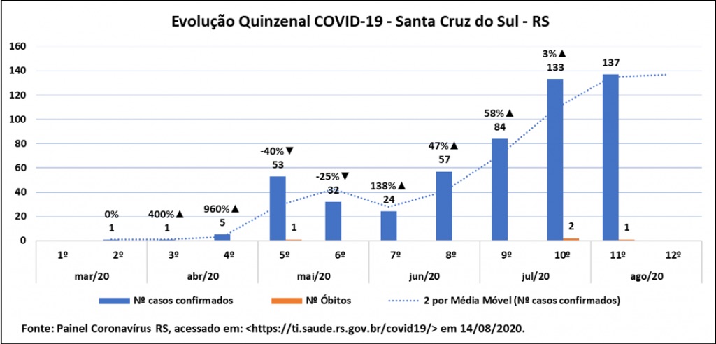 Passados quase cinco meses da confirmação do primeiro caso de Covid-19 em Santa Cruz do Sul, o avanço da doença no município finalmente começa a dar sinais de desaceleração. Dados do Observatório do Desenvolvimento Regional (ObservaDR), projeto que integra o Programa de Pós-Graduação em Desenvolvimento Regional da Unisc, mostram que na segunda quinzena de julho e na primeira de agosto, o número de casos confirmados foi semelhante, indicando estabilização. A média de 135 casos a cada 15 dias, entretanto, é considerada alta.
