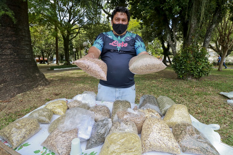 O casal Cláudio e Alzira Sales está vendendo ervas medicinais na Praça Getúlio Vargas, no Centro de Santa Cruz do Sul, até esta quinta-feira, 25. Os dois são índios de uma tribo caingangue de Miraguaí, no Noroeste do Estado, e oferecem 90 tipos de plantas procedentes do Mato Grosso, Pará e Amazonas.