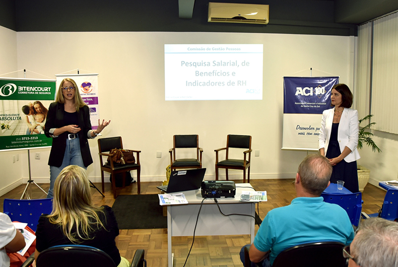 A diretora de Desenvolvimento Humano da ACI e coordenadora da Comissão de Gestão de Pessoas, Keli Geller, e a diretora de Relações do Trabalho da entidade, advogada Betina Kipper, apresentaram detalhes do projeto ao público que compareceu ao evento. Conforme a coordenadora da Comissão, por meio da pesquisa salarial será possível entender, por exemplo, como as empresas da região remuneram os empregados, levando em consideração o porte de cada organização. “Isso permite a empresa fazer um comparativo para saber como está em relação à média do mercado”, esclarece Keli.