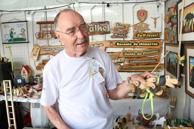 Em meio aos doces, artesanatos, produtos coloniais e de vestuário, um dos estandes que também chamou a atenção este ano foi o do artesão Roberto Gartner. De Ijuí, ele expôs pela primeira vez na festa e elogiou a organização. “Tudo muito bem preparado e com boas atrações para o público”, avaliou. À venda, ele tinha objetos decorativos e brinquedos feitos em madeira reciclada. “Uso sobras, palets e madeiras que encontro na rua, e todos os brinquedos são muito duráveis. Estamos na era da informática e sabemos que não tem como voltar. As crianças gostam de ficar no celular, mas também é muito importante que elas tenham outras opções de atividades”, comentou.