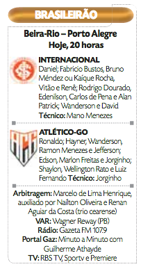 O técnico Mano Menezes comandou um treino fechado no domingo, 29, no CT Parque Gigante, para definir a escalação do Internacional, que joga nesta segunda-feira, 30, às 20 horas, contra o Atlético-GO no Beira-Rio, pela oitava rodada do Brasileirão. Com Gabriel Mercado suspenso, Bruno Méndez e Kaique Rocha disputam a posição. Mauricio e Alemão são baixas por lesão.