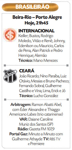 De um lado um time que tem remotas chances de almejar o título, mas que entra em campo buscando, pelo menos, aproximar-se de uma vaga direta na Libertadores. Do outro, um adversário que não vence há sete jogos e que precisa se reabilitar a fim de escapar da zona do rebaixamento. É nesse ambiente, e em busca da vitória, que Internacional e Ceará se enfrentam nesta quarta-feira, 26, às 21h45, no Beira-Rio, pela 34ª rodada do Brasileirão.