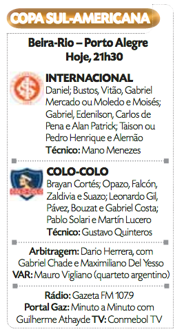 Do outro lado, o Inter vai encontrar um Colo-Colo em boa fase, na lide-rança do Campeonato Chileno e com uma estratégia definida para sair classificado do Beira-Rio. “Temos que fazer um jogo inteligente que nos permita manter a vantagem conquistada em Santiago. Com o passar dos minutos, haverá mais situações e espaços que poderemos aproveitar. Temos que convencê-los de que a partida está 0 a 0, que é um novo jogo. Devemos empatar ou vencer, manter o zero no nosso objetivo e não parar de pensar no objetivo do rival”, comentou o treinador Gustavo Quinteros.