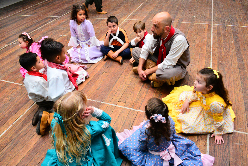 Para atrair a atenção do grupo, não faltam também brincadeiras antigas (pega-pega, dança da cadeira, ovo choco e pagar prenda) e oficinas. Na companhia dos pais, aprendem lições gastronômicas e artísticas, além de preparar o chimarrão e fazer o nó de lenço.