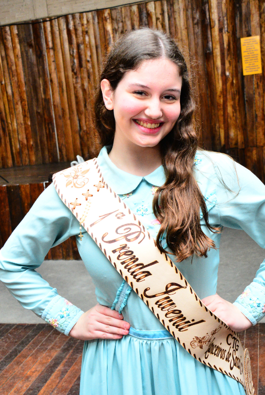 A 1ª prenda juvenil do CTG Lanceiros de Santa Cruz, Anita Neitzke de Oliveira, de 14 anos, está nas atividades da entidade há sete anos. Seus pais participavam da Invernada Xirú e ela acompanhava, sempre com vontade de dançar.