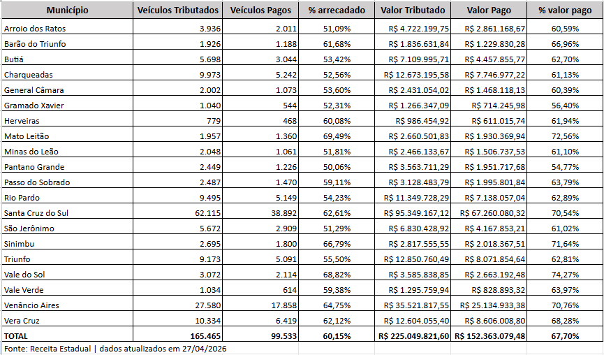 Na área da 7ª Delegacia de Receita Estadual, com sede em Santa Cruz do Sul e abrangência em 20 municípios, 60,15% dos contribuintes já haviam quitado o imposto até a última segunda-feira, 27. Em Santa Cruz do Sul, dos 62.115 veículos tributáveis, 38.892 estavam em dia – o equivalente a 62,61%. O município tem arrecadação prevista de R$ 95,3 milhões; desse montante, R$ 67,3 milhões já foram pagos.