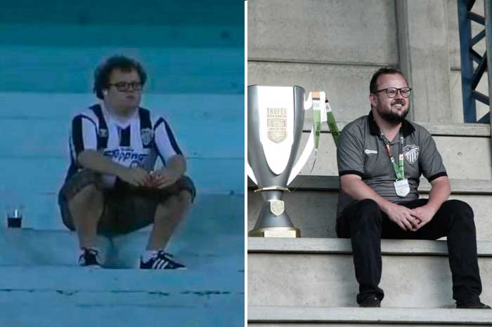 À esquerda, Tiago em 2012, quando assistiu, solitário, a uma derrota do Galo no Estádio Olímpico; à direita, ele com a taça que, como dirigente, ajudou o clube a conquistar