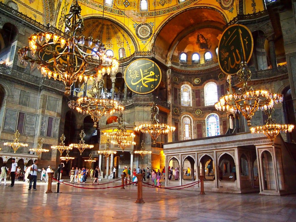 Os painéis de mármore nas paredes foram trazidos da vizinha Marmara, ilha que deu origem à palavra “mármore” e ao Mar de Marmara, entre o Bósforo e o Mar Mediterrâneo. Foi em Santa Sofia que, em 1054, aconteceu a excomunhão do patriarca Miguel I, determinando o Grande Cisma do Oriente que perdura até hoje. Com a tomada dos turcos otomanos, em 1453, minaretes foram adicionados e antigos mosaicos terminaram cobertos com gesso. Medalhões pendentes nas paredes da nave contêm os nomes de Maomé e dos primeiros califas do Islã. No início do século 20, os magníficos mosaicos bizantinos ressurgiram, graças ao trabalho de restauração ordenado por Atatürk, em 1931. Desde 2020, por uma decisão polêmica muito contestada do governo de Recep Erdogan, o local deixou de ser museu e voltou a ser uma mesquita.