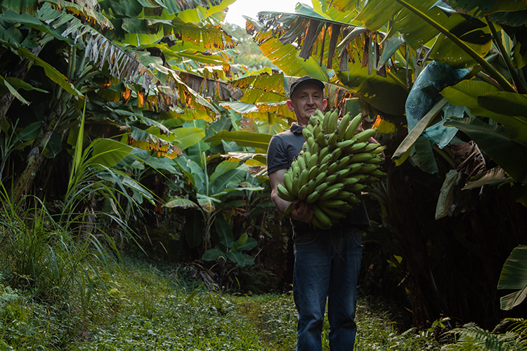 Na localidade de São Martinho, Perci Darcisio Frantz produz bananas e frutas cítricas há mais de uma década. Aos 48 anos, faz parte do grupo de pessoas que, após passar a infância no interior, deixou o meio rural para tentar a sorte na cidade, mas acabou retornando.