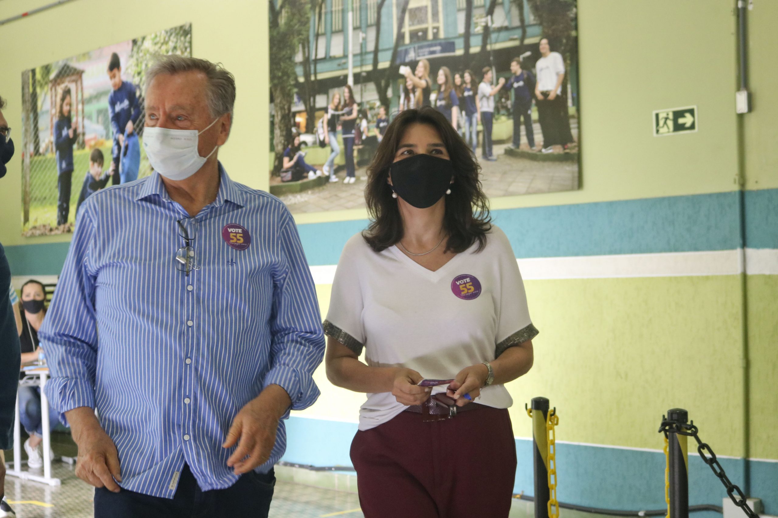Candidata Jaqueline Marques, do PSD, partido do prefeito Telmo Kirst, votou no Colégio Marista São Luís ao lado do vice, Ido Dupont