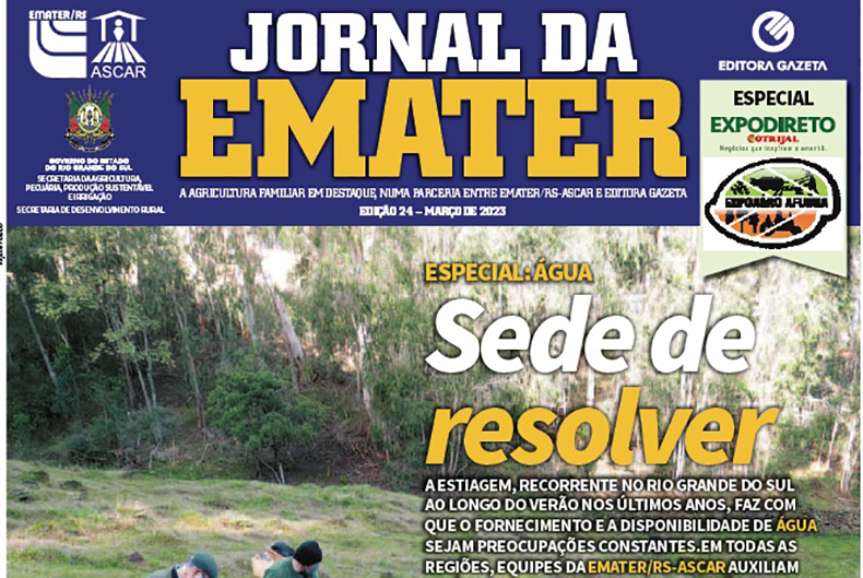 Alusivo a essas duas importantes feiras, uma mais identificada com o agro empresarial, a Expodireto, e outra com a agricultura familiar, a Expoagro, o Jornal da Emater, em 32 páginas, aborda temas variados das regionais da empresa de assistência técnica e extensão rural. A reportagem de capa é dedicada ao assunto Água, diante da recorrência da estiagem ao longo do verão nos últimos três anos. São evidenciadas iniciativas para armazenamento de água, em cisternas e também em açudes, tanto para dessedentação de animais quanto para irrigação.