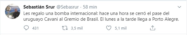 Uma notícia surpreendeu e encheu a torcida do Grêmio de esperança na tarde desta sexta-feira, 4. O jornalista argentino Sebastián Srur, da Rádio Continental, publicou na conta dele na rede social Twitter que o craque uruguaio Edinson Cavani, de 33 anos, teria acertado sua transferência para o tricolor gaúcho. A direção do Grêmio já se pronunciou e nega o acerto.